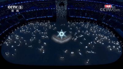 冰立方升起来之后,过去整整二十二届以及二十三届冬奥会举办城市的过往历史逐一闪烁不停。冰球撞击了冰立方,冰雪五环从其内部“破冰而出”。此环节的难点在于使得五环的碎裂效果同冰立方的结构精准配合。团队透过预演系统再三模拟撞击点、碎片飞溅方向以及五环上升速度,最终达成了零误差的现场呈现。