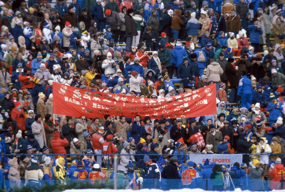 1980年2月14日,于美国普莱西德湖冬奥会开幕式之际,当中国代表团举着五星红旗步入场时,看台上拉起了写有“热烈欢迎中华人民共和国运动队”字样的横幅,这是中国奥委会恢复国际奥委会合法席位之后,首次派遣队伍参与冬季奥运会。