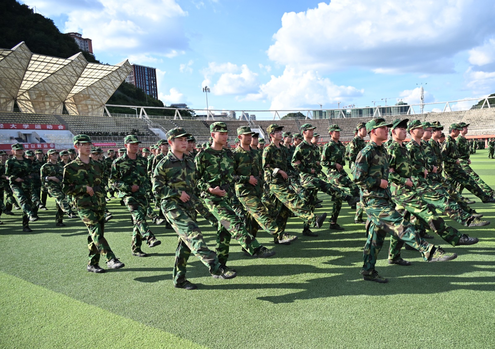 军训场上,国旗护卫队方阵成了焦点,约400名新生构成两个方阵其身穿迷彩服,手持“钢枪”迈着铿锵有力步伐护送护旗手走过观礼台,身为公共管理学院社会工作专业大一新生的商慕云来自吉林省,其从小爱看军旅题材影视作品,对军人不怕苦不怕累精神特别敬佩,加入国旗护卫队后他们训练时间比其他连队长,对军姿、队列、正步和齐步要求也更高。