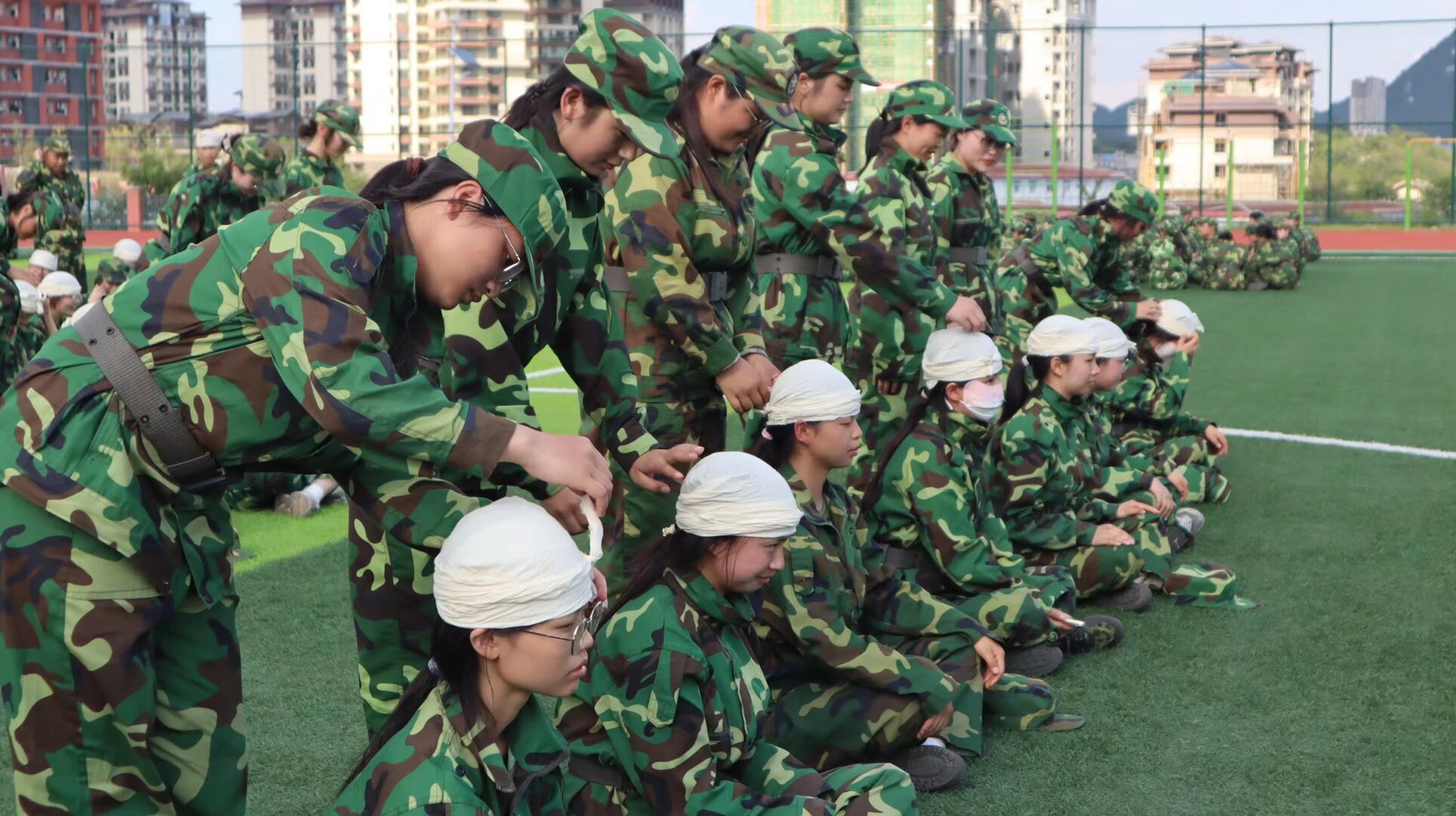 于贵州财经大学的军训现场之中,7100余名新生依照部队建制被编排成多个连队。9月2日,体育场上正进行的乃是三角巾帽式包扎法教学。学生们以5人为一组展开演练,此项技能是今年军训考核的重要内容。学校武装部副部长文静予以介绍,今年的军训自8月25日启动直至9月7日结束,重点置于了军事技能训练与考核之上。训练计划里,除将常规的军姿队列列入外,还把战术训练列入了,把医疗救护列入了,把防毒面具佩戴列入了,把防卫技能也列入了 ,每一项训练结束之后,都要开展考核 ,以此来保证学生切实掌握。